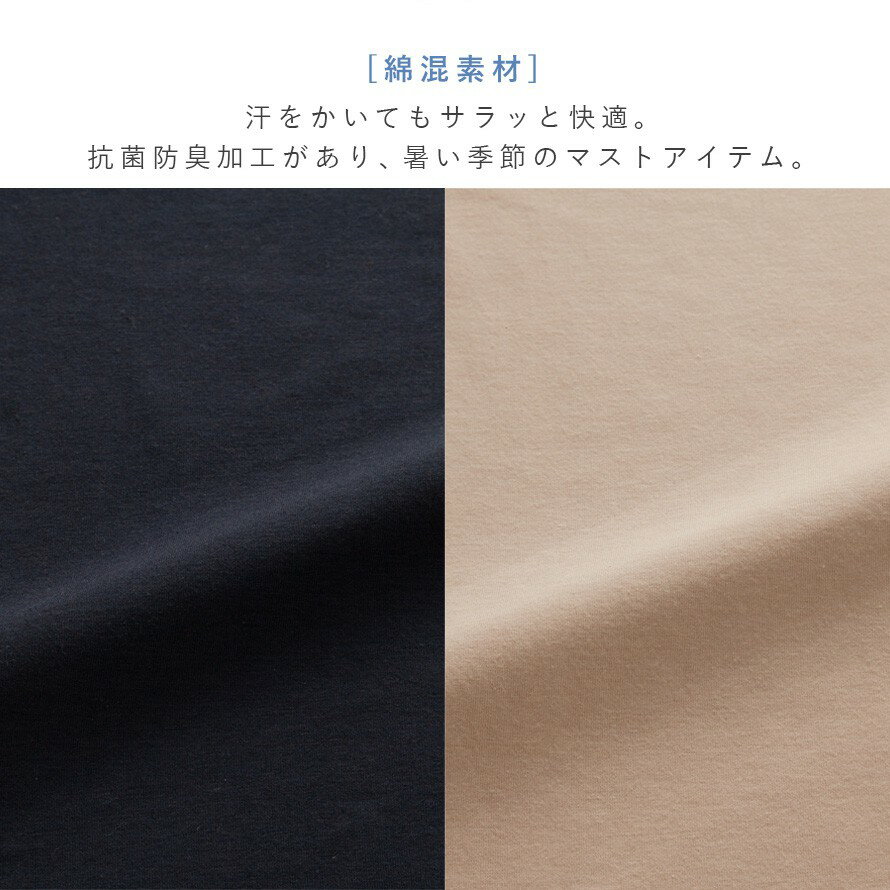綿混素材、吸水速乾、抗菌防臭、タテヨコストレッチ、汗脇パッド付き。